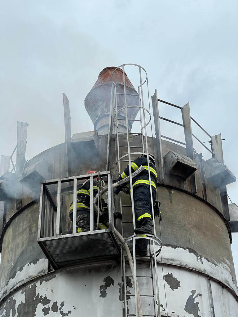 Ajunși la fața locului, pompierii au constatat că incendiul se manifesta violent în interiorul unui siloz cu rumeguș, cu degajări mari de fum, flăcările alimentate de cantitatea mare de materiale combustibile depozitate în interiorul acestuia, amenințând să se extindă la trei hale de depozitare a lemnului, aflate în imediata proximitate.