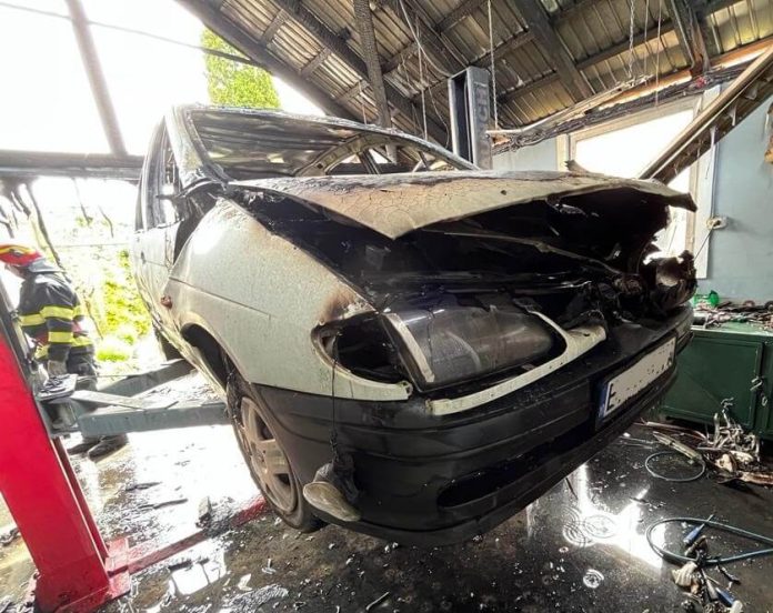 Au ars autoturismul aflat în interiorul garajului, acoperișul construcției și elemente de mobilier.