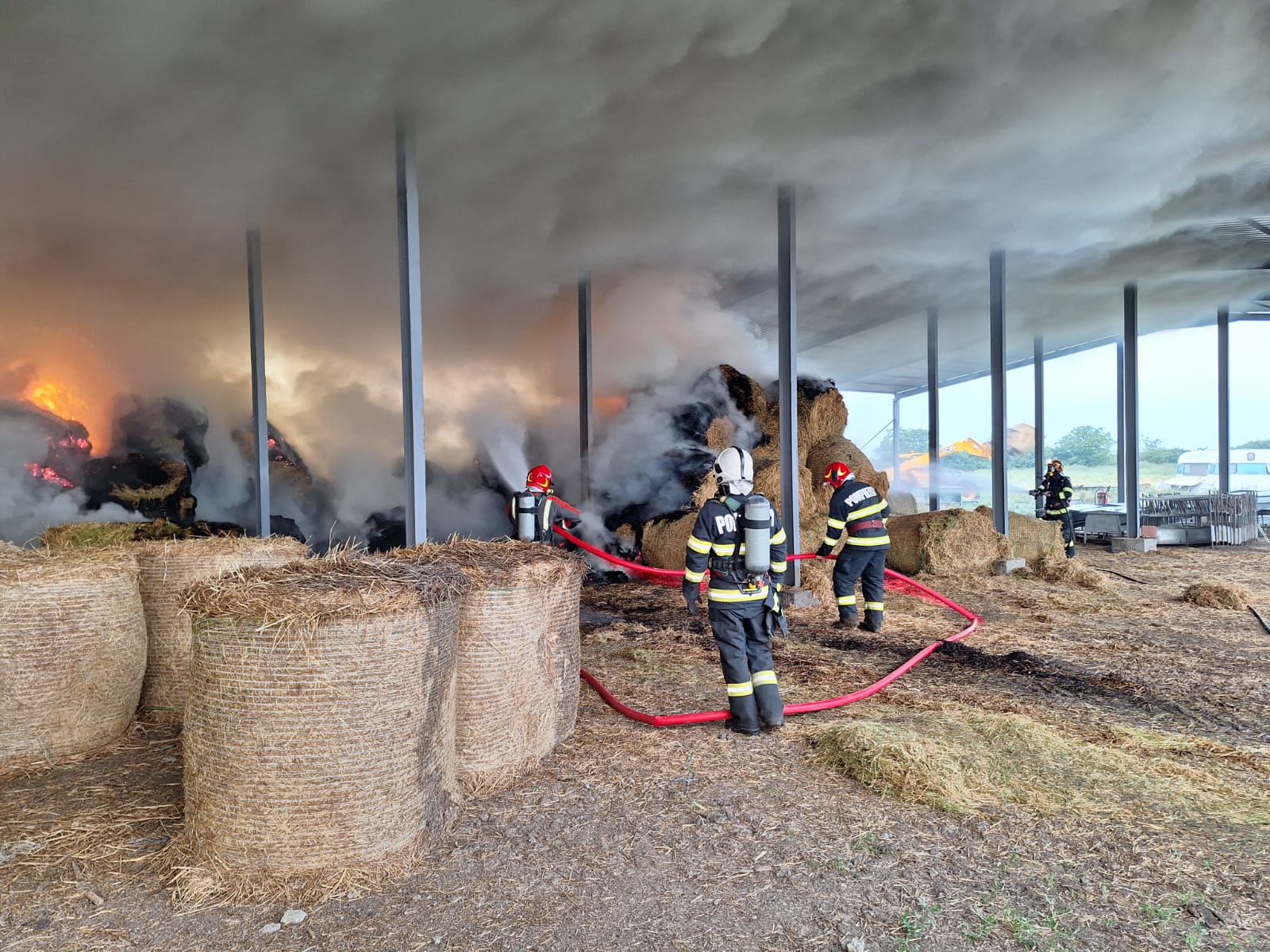 În momentul sosirii echipajelor la fața locului, ardea aproximativ jumătate din cantitatea de plante furajere depozitate în fânar, flăcările amenințând să se extindă la alte sute de baloți din interiorul construcției.