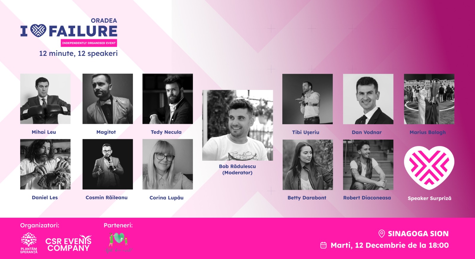 I Love Failure Hope vine la Oradea pentru prima dată pe 12 decembrie. Puteți petrece mai multe ore magice alături de speakeri de renume din domenii precum antreprenoriat, teatru, medicină, sport, psihologie sau dezvoltare personală . Toate acestea pentru a vedea care este rolul eșecului în drumul către succes. Evenimentul va avea loc într-o locație de gală și anume, Sinagoga Sion.
