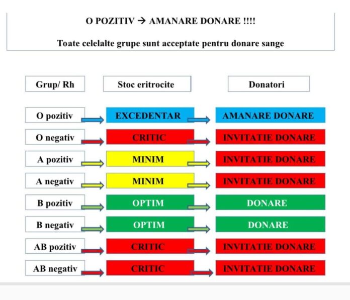 „Dragii noștri donatori!!!! Situația rămâne neschimbată pentru donatorii cu grupa sanguină O pozitiv, pentru care revenim cu rugămintea de a amâna donarea de sânge, până când nevoile pacienților vor duce la scăderea stocului! Donatorii care au grupa sanguină la care stocurile sunt MINIME sau CRITICE, sunt rugați să se prezinte/ programeze pentru donarea de sânge!