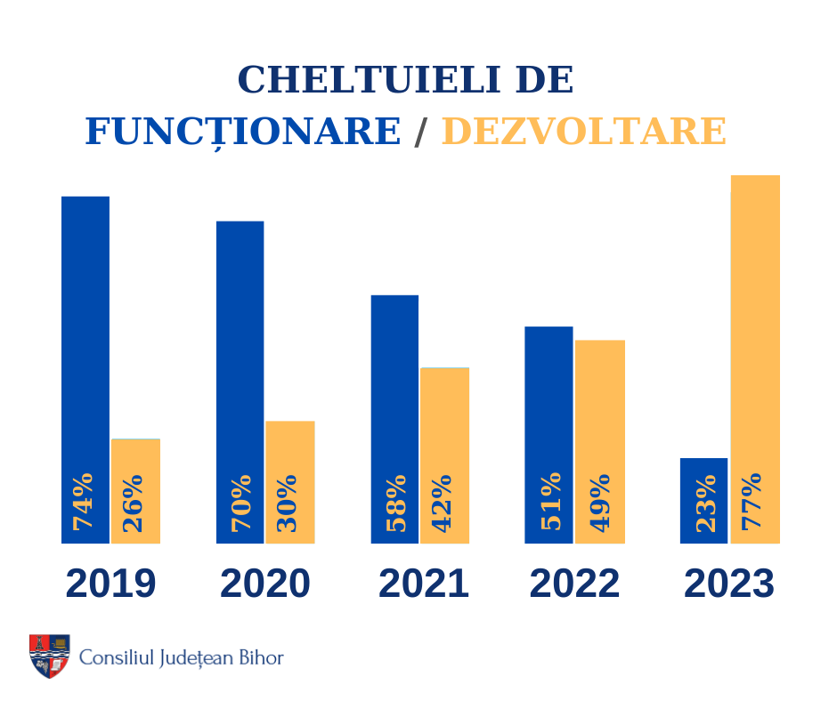 În 2023, investițiile au reprezentat 77% din bugetul total, în timp ce cheltuielile de funcționare au fost reduse la un sfert. În 2023, bugetul de dezvoltare a fost de 1,13 miliarde de lei, iar cel de funcționare, de 341 de milioane de lei.