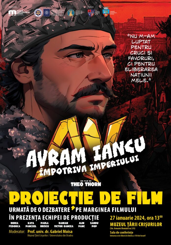 Muzeul Țării Crișurilor Oradea – Complex Muzeal, împreună cu Facultatea de Istorie, Relații Internaționale, Științe Politice și Științele Comunicării și Centrul de Studii Interdisciplinare și în parteneriat cu Consiliul Județean Bihor și Primăria Municipiului Oradea, vă invită sâmbătă, 27 ianuarie, ora 13:00, la sediul Muzeului Țării Crișurilor (Str. Armatei Române nr.1/A), în sala de conferințe, la premiera națională într-o instituție publică, a proiecției filmului Avram Iancu – Împotriva imperiului (2024), durata 67 de minute, în regia lui Theo Thorn.