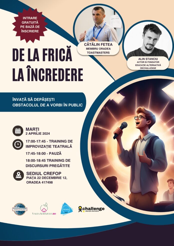 Un nou proiect inedit în domeniul dezvoltării personale și profesionale este pe cale să fie lansat în luna aprilie a anului 2024 de către Asociația FRENDS pentru Dezvoltare filiala Oradea, oferind studenților o oportunitate unică de a-și îmbunătăți abilitățile de comunicare și expresie creativă prin improvizație teatrală și public speaking.