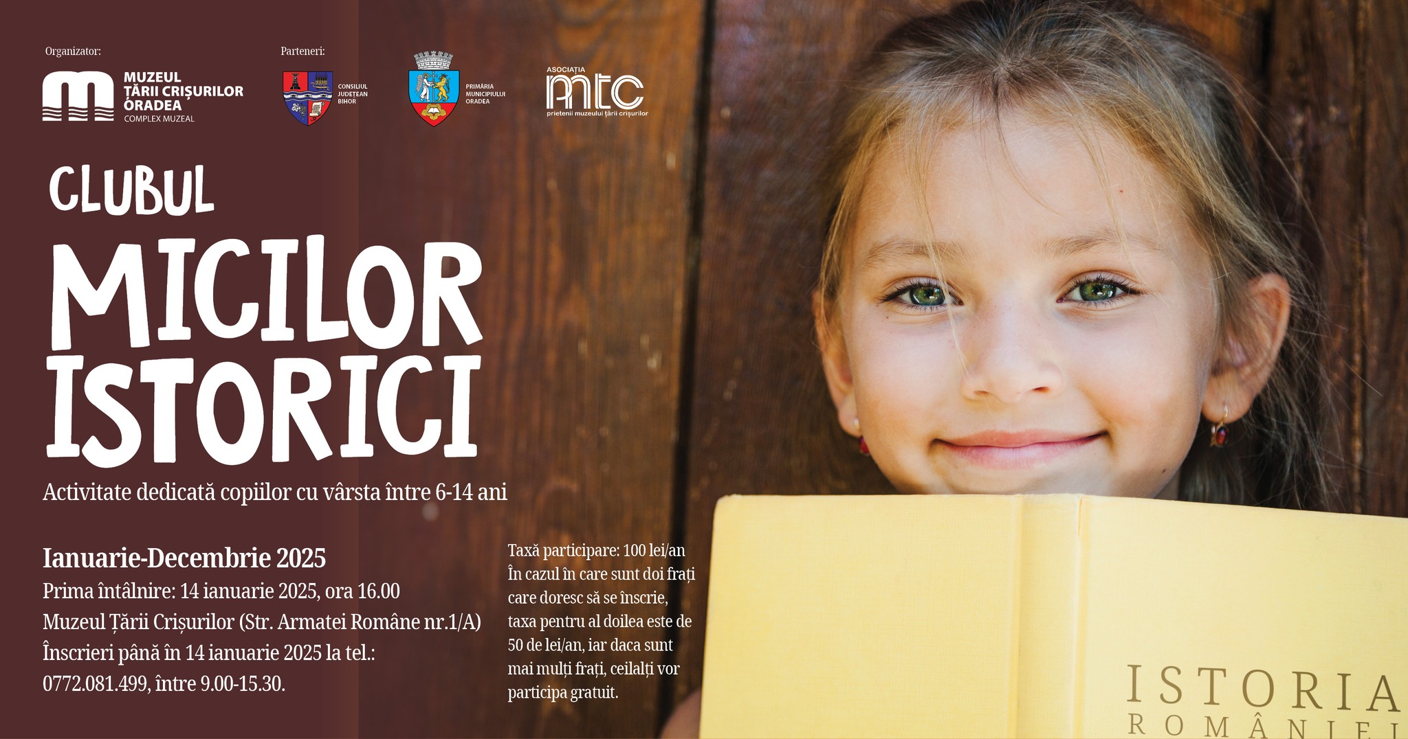 Muzeul Țării Crișurilor Oradea – Complex Muzeal, în colaborare cu Asociația „Prietenii Muzeului Țării Crișurilor și cu sprijinul Consiliului Judetean Bihor și al Primăriei Municipiului Oradea, organizează și anul acesta „Clubul Micilor Istorici”, o activitate de educație nonformală care se adresează copiilor cu vârste cuprinse între 6-14 ani, ce sunt pasionați de istorie.