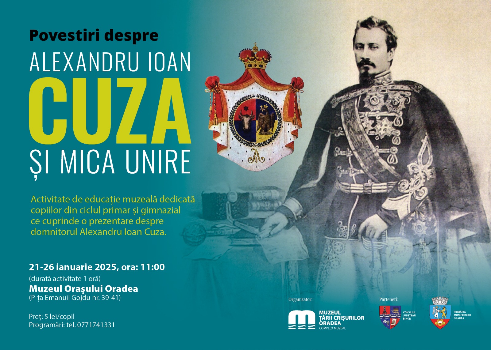 Muzeul Țării Crișurilor Oradea – Complex Muzeal organizează, în parteneriat cu Consiliul Județean Bihor și Primăria Municipiului Oradea, atelierul de educație muzeală Povestiri despre Alexandru Ioan Cuza și Mica Unire. Acesta se va desfășura în perioada 21-26 ianuarie 2025, orele 11:00-12:00, la Muzeul Orașului Oradea (P-ța Emanuil Gojdu nr. 39-41).