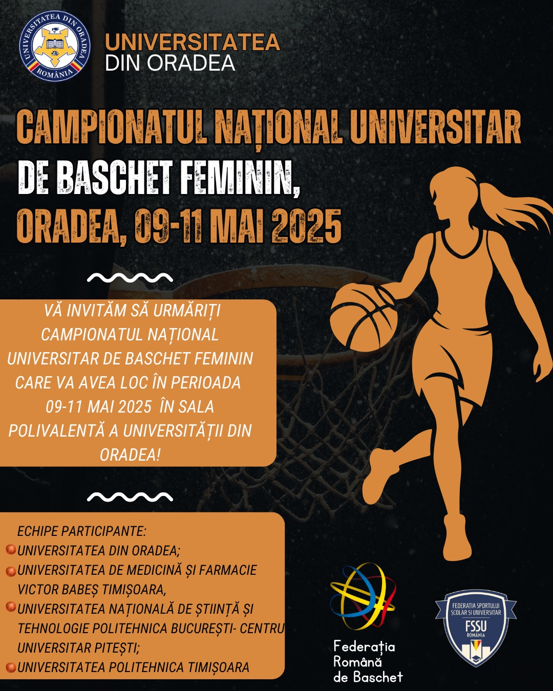 În organizarea Federației Sportului Școlar Universitar, în colaborare cu Universitatea din Oradea și Federația Română de Baschet, Campionatul Național Universitar va aduce sub panou, de vineri până duminică (9-11 mai 2025), în sala Polivalentă a Universității din Oradea, patru echipe: