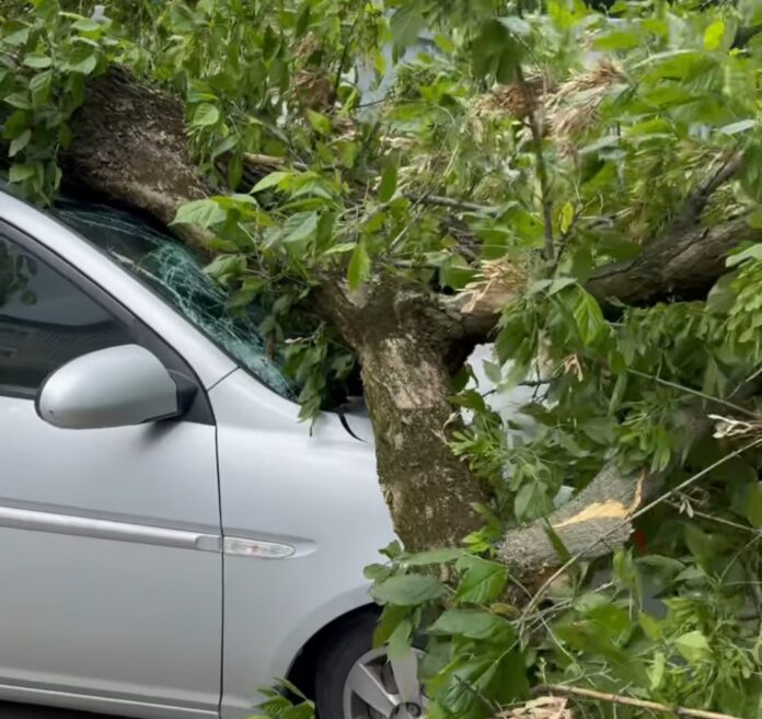 Un internaut a postat pe grupul Info Trafic Bihor &Oradea un videoclip în care se vede cum un copac a fost doborât de vânt peste o mașină, pe strada Selimbărului din Oradea.