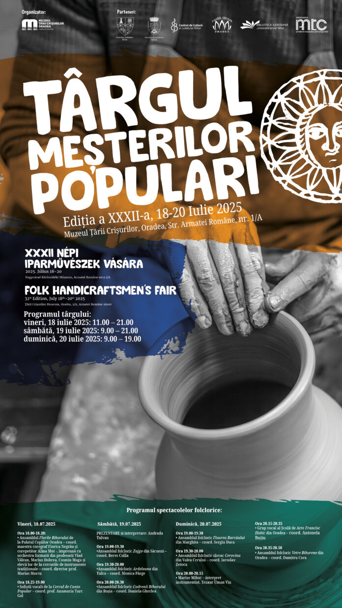 Între 18–20 iulie 2025, Muzeul Ţării Crişurilor Oradea – Complex Muzeal organizează în parteneriat cu Consiliul Judeţean Bihor, Primăria Municipiului Oradea, Centrul de Cultură al Județului Bihor, Palatul Copiilor Oradea, Biblioteca Județeană „Gheorghe Șincai” Oradea și Asociaţia „Prietenii Muzeului Ţării Crişurilor” cea de a XXXII-a ediție a Târgului Meşterilor Populari din România, care va avea loc în parcul Muzeului Țării Crișurilor din Oradea, Str. Armatei Române, nr. 1/A.