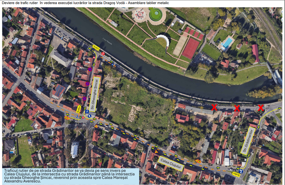 Circulația pe str. M. A. Averescu se va devia din zona Podului CFR pe str. Grădinarilor, respectiv pe Calea Clujului (stradă pe care se va circula în dublu sens de la str. Grădinarilor până la intersecția cu Gh. Sincai)