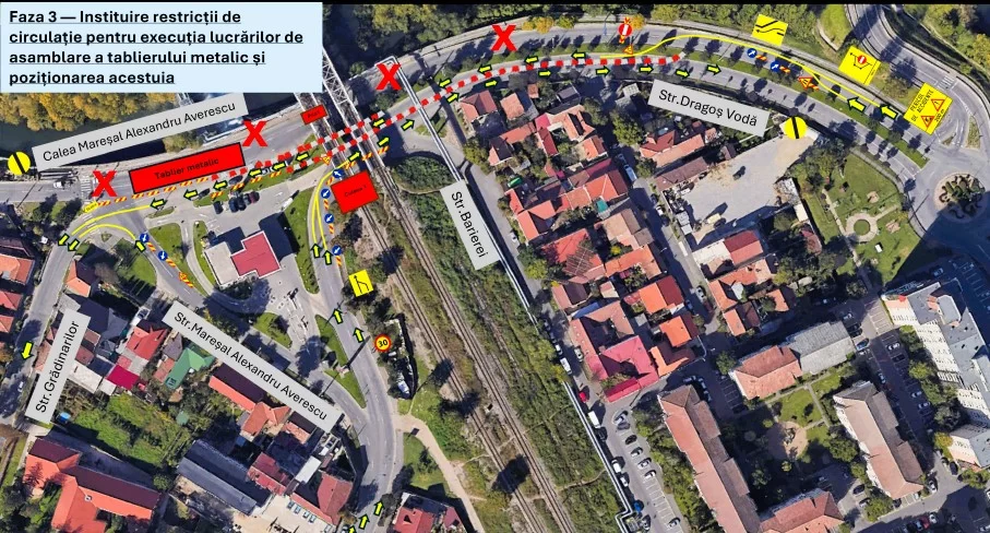 În cadrul proiectului de modernizare a liniei de cale ferată derulat de S.C. Webuild S.p.A., se vor institui restricții de circulație pentru asamblarea tablierului metalic al podului: