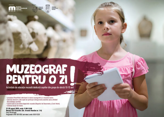Muzeul Țării Crișurilor Oradea – Complex Muzeal organizează, în parteneriat cu Consiliul Județean Bihor și Primăria Municipiului Oradea, activitatea de educație muzeală Muzeograf pentru o zi!, adresată elevilor cu vârste cuprinse între 10-15 ani. Aceasta se va desfășura la sediul instituției din Str. Armatei Române nr.1/A, în perioada 27-29 august 2025, orele 11.00-13.00.