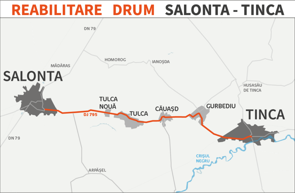 Mircea Mălan, președintele Consiliului Județean Bihor, a susținut astăzi, 18 august 2025, o conferință de presă în teren, pe Drumul Județean (DJ) 795 Salonta – Tinca, aflat în reabilitare. La conferință au participat primarul municipiului Salonta, Torok Laszlo, primarul comunei Tinca, Vlad Popa, și Florin Man, șeful de șantier din partea firmei Diferit, responsabilă de lucrări.