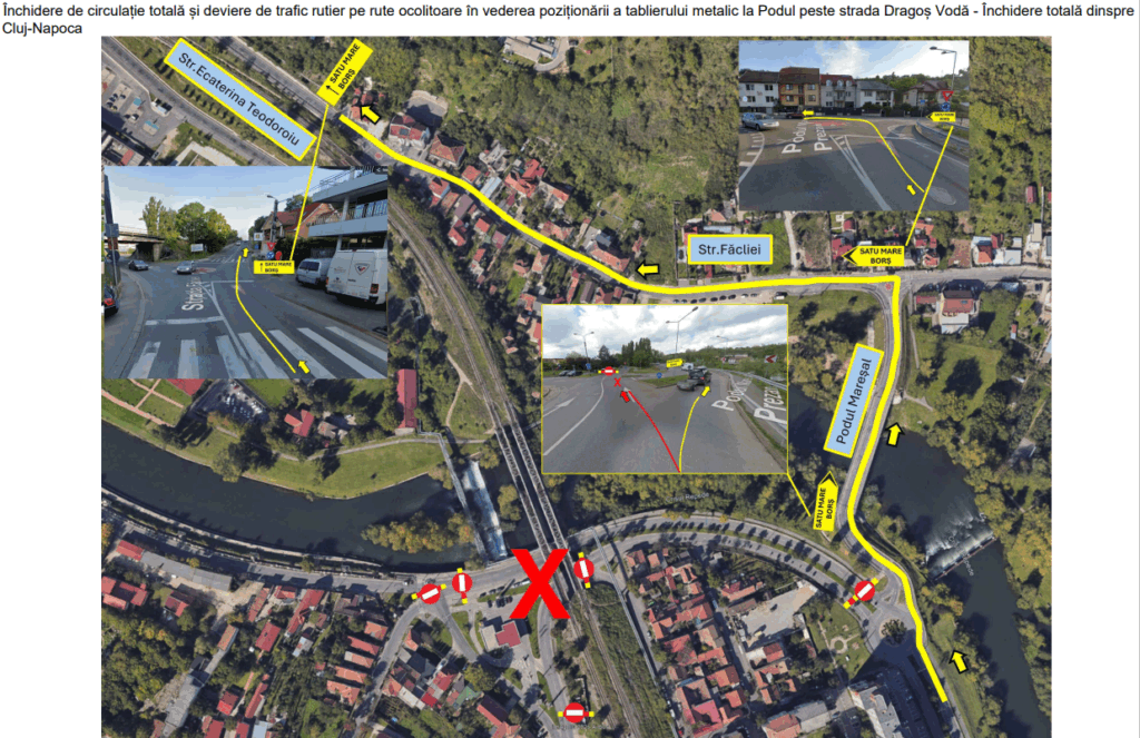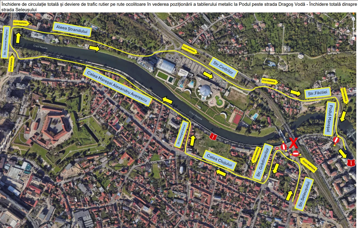 Dinspre Cluj-Napoca – circulația se va devia pe strada Ecaterina Teodoroiu – strada Făcliei – Podul Mareșal – strada Seleușului.