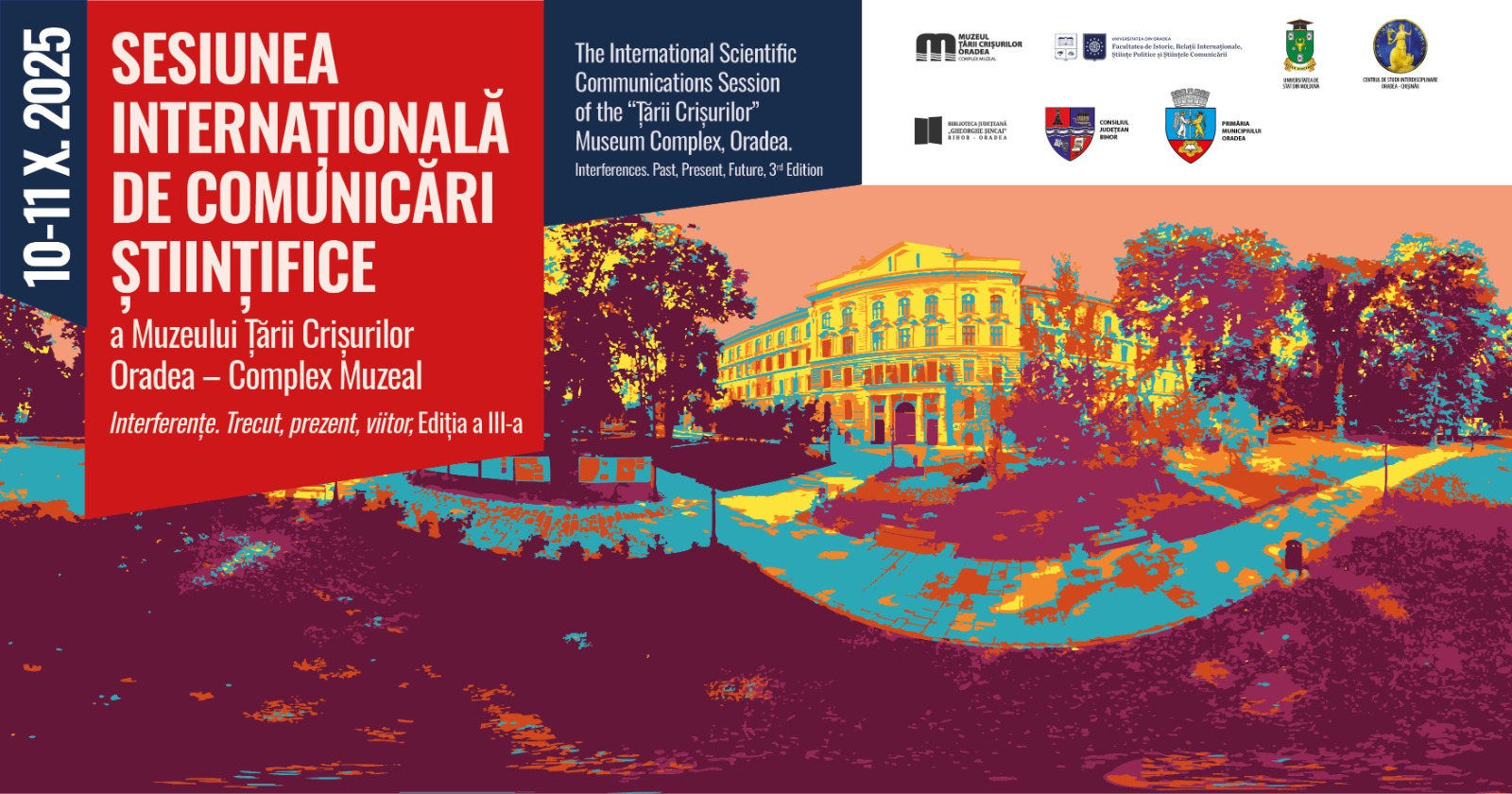 Muzeul Țării Crișurilor Oradea – Complex Muzeal, împreună cu Facultatea de Istorie, Relații Internaționale, Științe Politice și Științele Comunicării din cadrul Universității din Oradea, Universitatea de Stat din Moldova, Centrul de Studii Interdisciplinare Oradea – Chișinău al Academiei Române, Biblioteca Județeană „Gheorghe Șincai” Bihor, Consiliul Județean Bihor și Primăria Municipiului Oradea, organizează, în perioada 10–11 octombrie a.c., a treia ediție a Sesiunii internaționale de comunicări științifice a Muzeului Țării Crișurilor Oradea – Complex Muzeal, intitulată Interferențe. Trecut, prezent, viitor.
