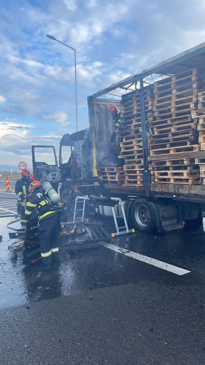 La sosirea forțelor de intervenție, ardeau violent cabina autovehiculului și o parte din cei 300 de europaleți transportați.