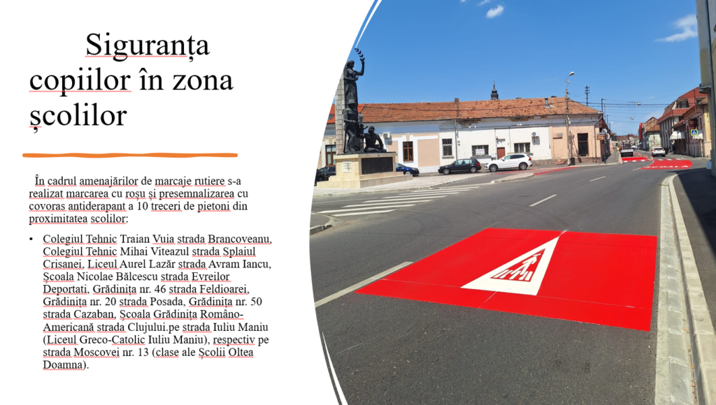 Pentru creșterea siguranței copiilor, au fost amenajate 10 treceri de pietoni în proximitatea unităților de învățământ. De asemenea, proiectul „Kiss and Ride” a fost implementat în zona Școlii Gimnaziale nr. 16. Rețeaua de piste pentru biciclete a fost extinsă cu 1.670 metri liniari, ajungând la aproximativ 52 km, urmărindu-se conectarea tronsoanelor existente.