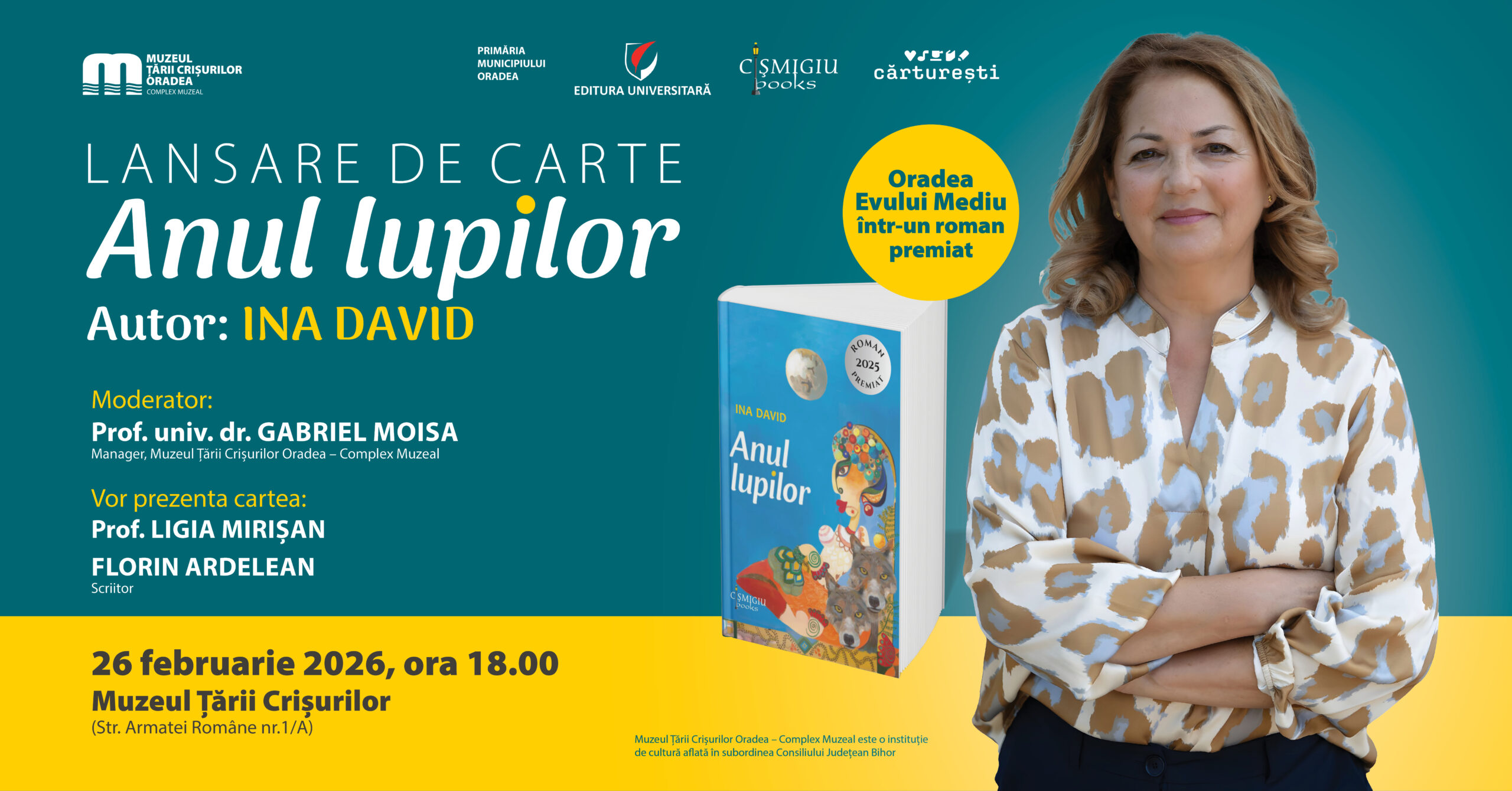 Muzeul Țării Crișurilor Oradea – Complex Muzeal, în parteneriat cu Consiliul Județean Bihor, Primăria Municipiului Oradea, Editura Universitară, Editura Cismigiu Books și Librăriile Cărturești, organizează evenimentul de lansare a cărții Anul lupilor, semnată de Ina David. Acesta va avea loc joi, 26 februarie a.c., ora 18.00, la Muzeul Țării Crișurilor (Str. Armatei Române nr. 1/A).