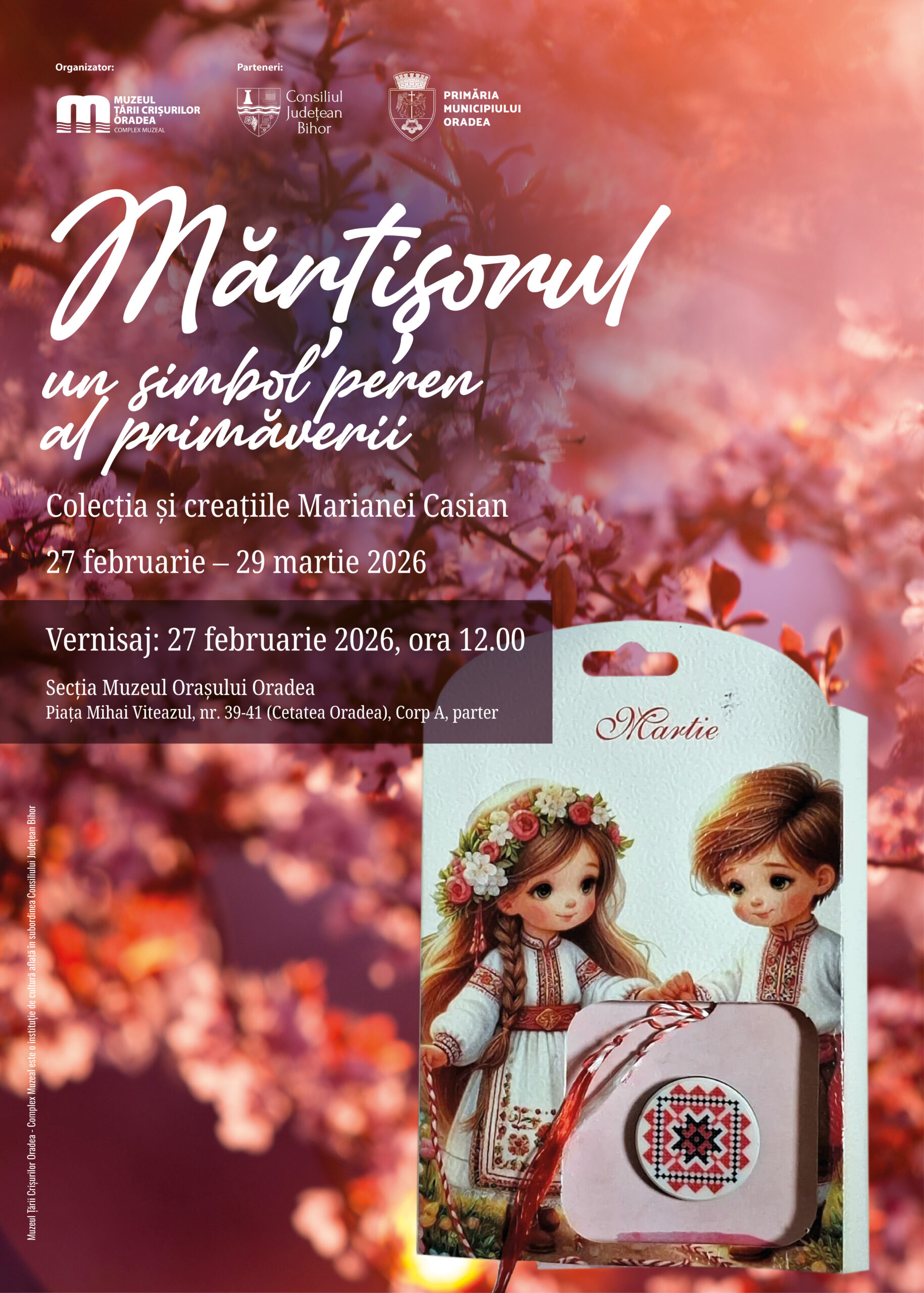 Muzeul Țării Crișurilor Oradea – Complex Muzeal, în parteneriat cu Consiliul Județean Bihor și Primăria Municipiului Oradea, organizează expoziția „Mărțișorul, un simbol peren al primăverii”, care cuprinde colecția și creațiile doamnei doctor Mariana Casian. Vernisajul va avea loc vineri, 27 februarie, de la ora 12.00, la Secția Muzeul Orașului Oradea (Cetatea Oradea, Piața Mihai Viteazul nr. 39-41, corp A, parter).