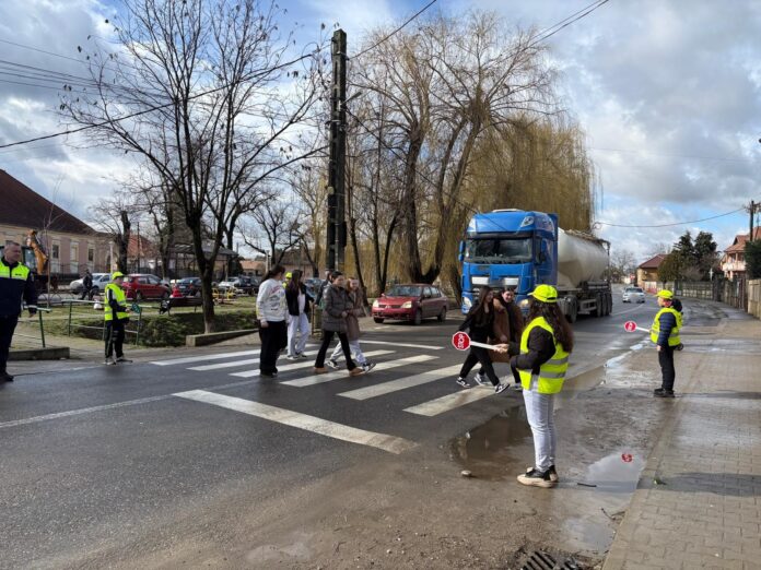 Sub atenta supraveghere a polițiștilor, elevii din patrula școlară de circulație de la Școala Gimnazială Nr.1 Tileagd au preluat responsabilitatea de a-și ghida colegii în traversarea corectă a străzii. Cu rigurozitate și atenție la detalii, aceștia au explicat și demonstrat cum să folosească trecerea pentru pietoni în siguranță, asigurându-se că fiecare elev respectă regulile de circulație.