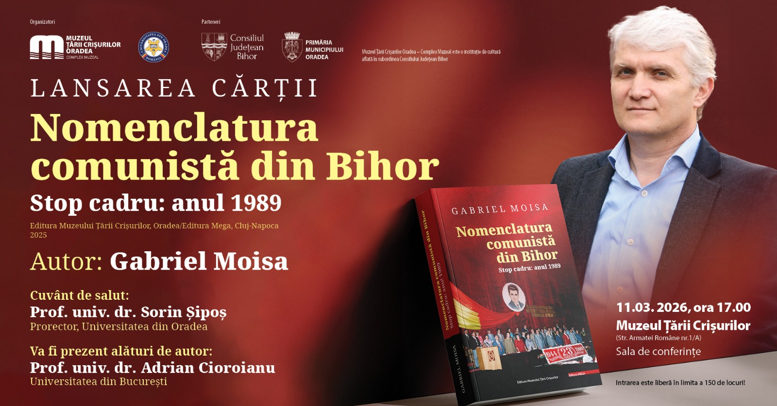 Muzeul Țării Crișurilor Oradea – Complex Muzeal, împreună cu Universitatea din Oradea și în parteneriat cu Consiliul Județean Bihor și Primăria Municipiului Oradea, organizează evenimentul de lansare a volumului Nomenclatura comunistă din Bihor – Stop cadru: anul 1989, semnat de istoricul Gabriel Moisa.