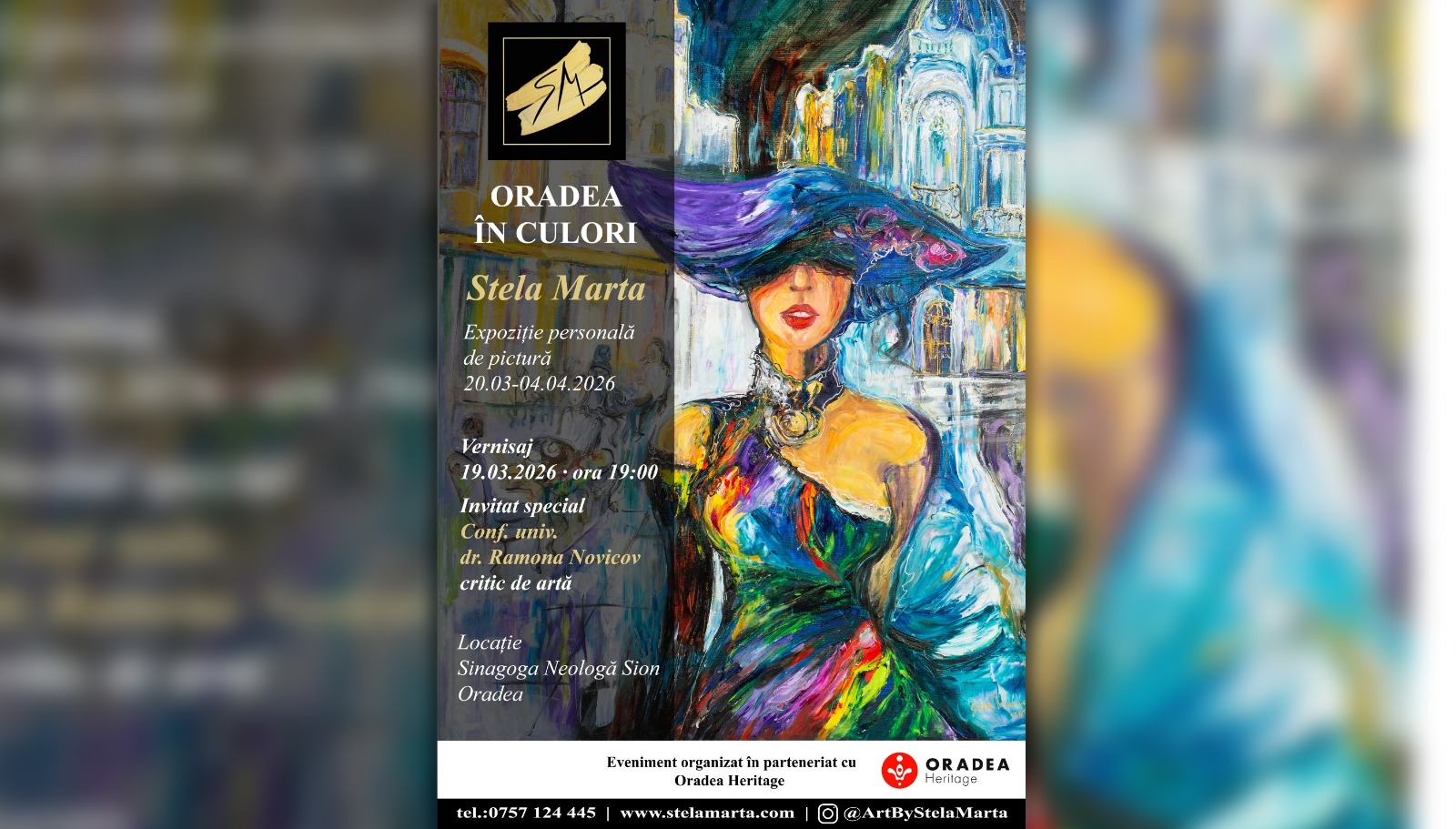 Sinagoga Neoloagă Sion (strada Independenței, nr. 22) va găzdui joi, 19 martie, vernisajul expoziției personale de pictură a artistei Stela Marta, intitulată „Oradea în culori”. Evenimentul va avea loc de la ora 19:00.