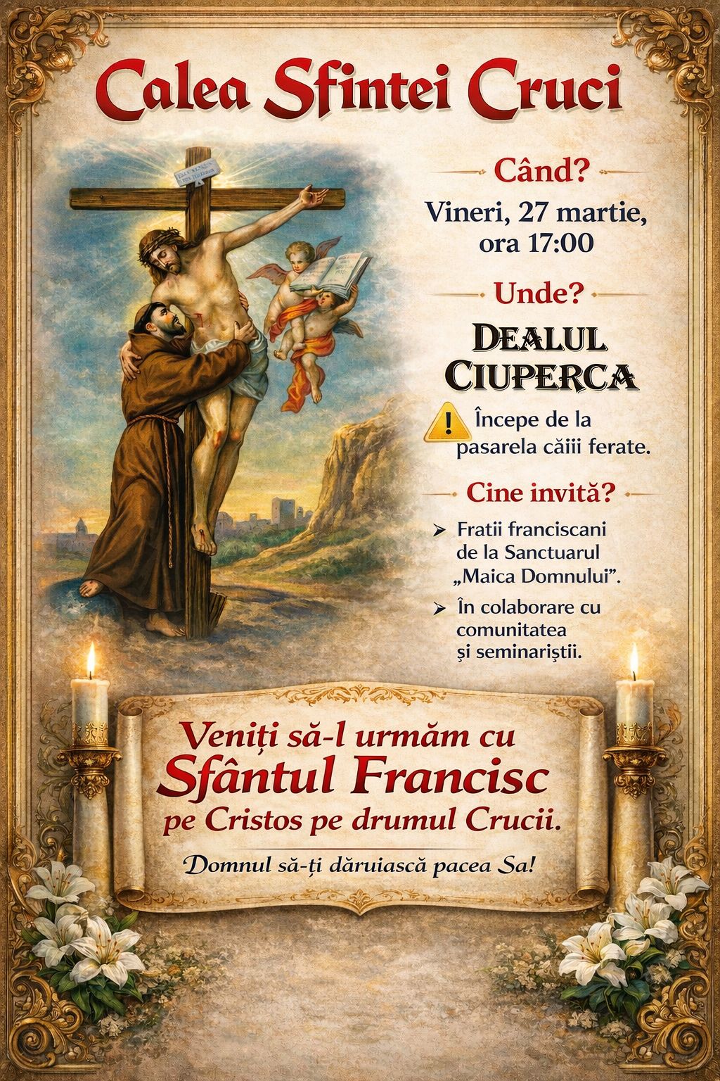 Frații franciscani de la Sanctuarul Eparhial „Maica Domnului” Oradea, în colaborare cu comunitatea locală și seminariștii de la Seminarul Teologic Greco-Catolic „Sfinții Trei Ierarhi”, invită credincioșii să participe la Calea Sfintei Cruci, care va avea loc vineri, 27 martie 2026, de la ora 17:00, pe Dealul Ciuperca din Oradea. Punctul de plecare este la pasarela Căii Ferate.