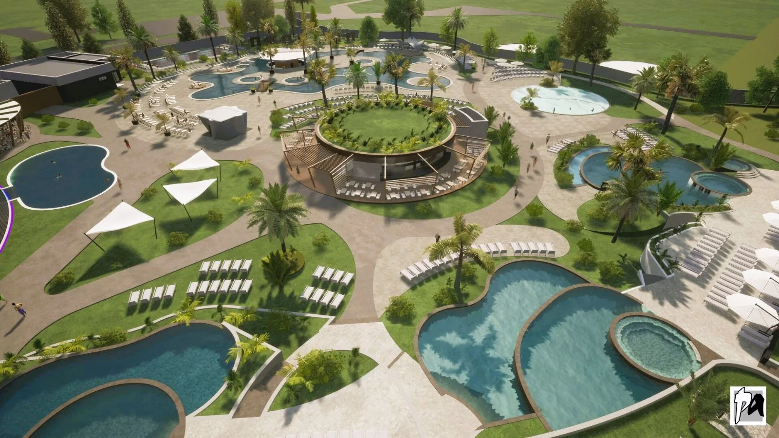 Cinci ansambluri de bazine exterioare, inclusiv bazin de înot și bazin de legătură interior–exterior, cu o suprafață totală de peste 3.000 mp, punct de alimentație publică cu grupuri sanitare, bar cu servire din apă, dușuri exterioare, platforme pentru plajă realizate din dale de piatră și deck, precum și numeroase zone verzi amenajate cu plante specifice zonelor cu apă termală.