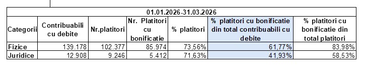 Peste 62% dintre orădeni și 42% dintre firme au optat pentru plata cu bonificație, adică au achitat integral, până la 31 martie, impozitul datorat pentru anul 2026.