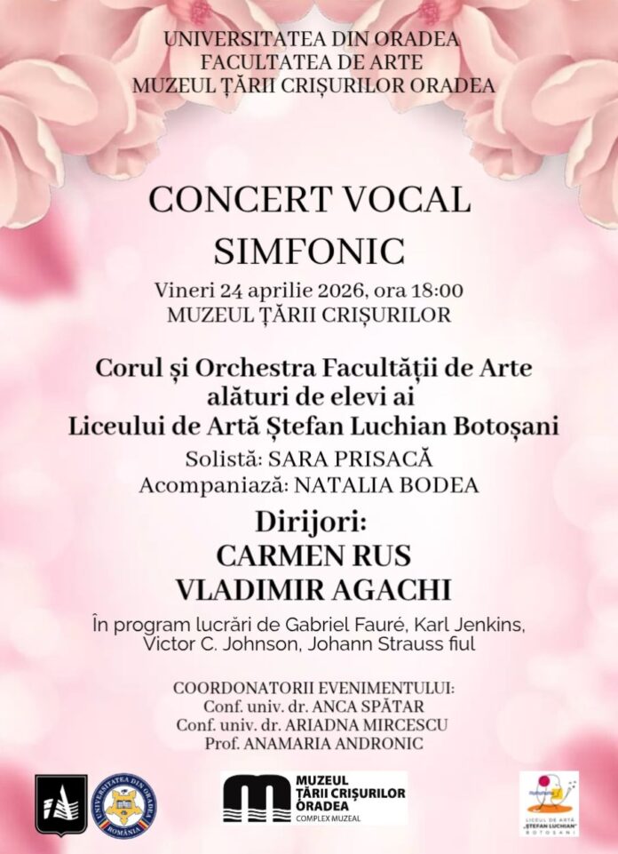 Sala de conferințe a Muzeului Țării Crișurilor va găzdui vineri – 24 aprilie 2026, începând cu ora 18:00, un concertul vocal-simfonic care îi va avea ca protagoniști pe studenții Departamentului de Muzică al Facultății de Arte, Universitatea din Oradea, alături de elevii Liceului de Artă „Ștefan Luchian”, din Botoșani. Intrarea este liberă, în limita locurilor disponibile, precizează organizatorii.