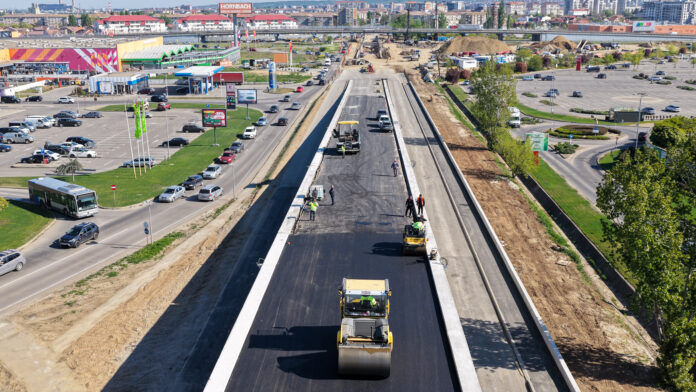 Sâmbătă, 18 aprilie 2026, a fost așternut primul strat de asfalt din cele două pe pasajul suprateran.