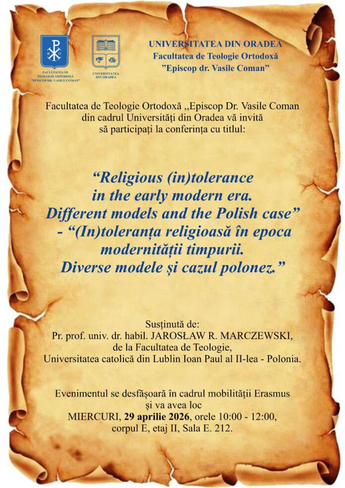 Facultatea de Teologie Ortodoxă „Episcop Dr. Vasile Coman”, a Universității din Oradea, organizează conferința cu titlul: „Religious (in)tolerance in the early modern era. Different models and the Polish case – (In)toleranța religioasă în epoca modernității timpurii. Diverse modele și cazul polonez”.