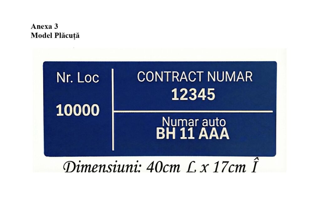 Plăcuța trebuie să respecte modelul prevăzut în regulament (dimensiuni: 40 cm × 17 cm) și să fie amplasată vizibil.